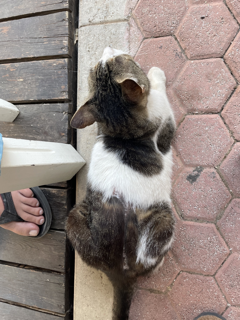 I feel like we have a special relationship. We have shared many meals, and now that her wounds are closed, I can pet her whole back! She will continue hanging out with me even after I no longer have any morsels to share. I joke about wanting to take her home to be my new BFF, but I think she’d really miss out on her evening routine of restaurant dinners. I don’t think kibbles and goop are gonna cut it after a nightly feast of such high caliber. We’ll see how she’s doing when the tourist season dies down though.