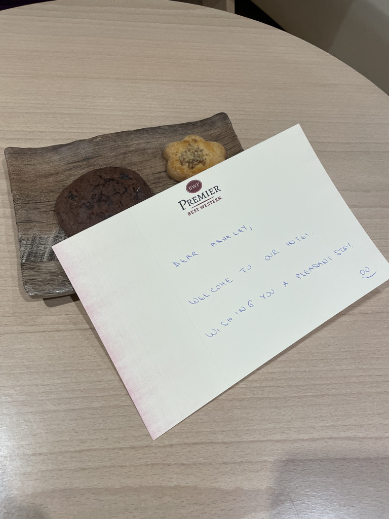 On my actual last night, I opted to stay at a hotel by the airport. I needed to be there bright and early, and I didn’t want to mess around with waking up extra extra early and driving. The hotel was very nice and left me a note with cookies! I’ve had people write my name ASHELY before, but never ASHELEY.