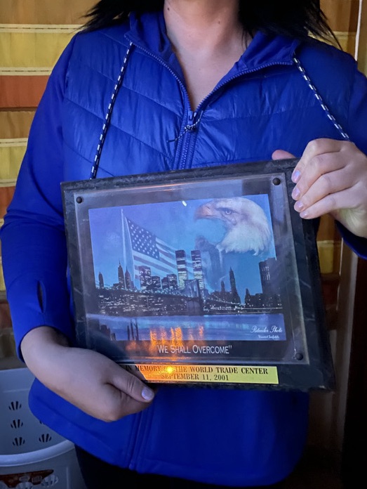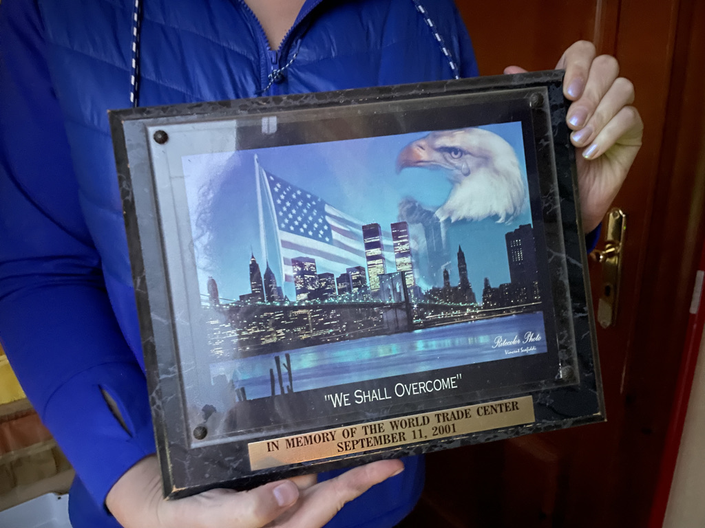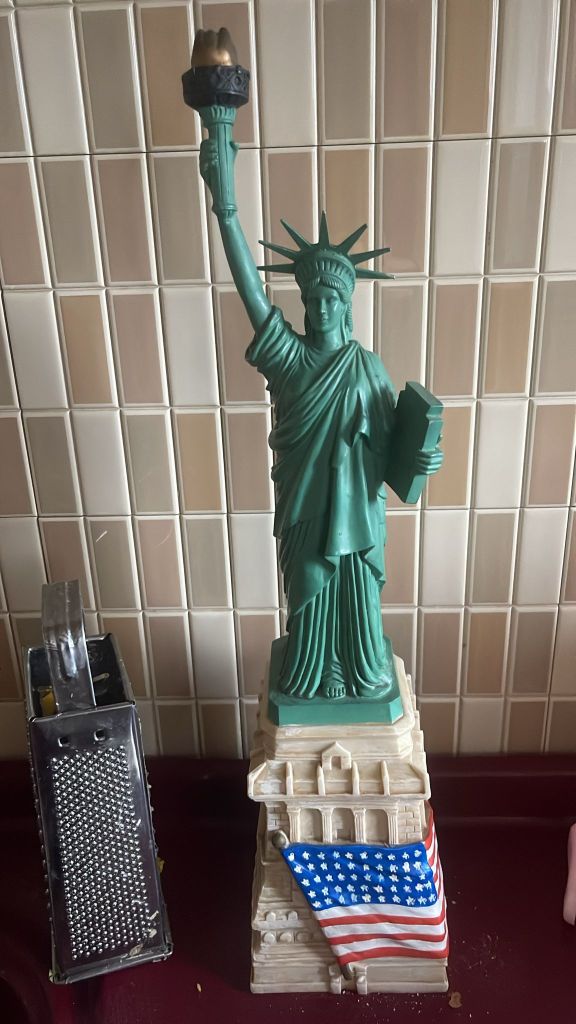 Ok so first of all, this statue of liberty was proudly displayed in Olya’s furnished apartment. Like it was on a pedestal next to the tv. I see she has moved it to just near the cheese grater, which is a bold choice. BUT THEN I needed some pants washed, and we decided to try the dryer out on the patio for the first time. It was leaking water, so I tried to see if I could figure out the issue. Imagine my shock when I found this 9/11 memorial plaque tucked behind the dryer.