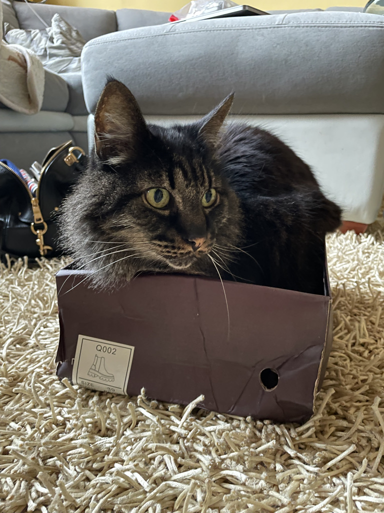 I bought this nice boot box for Crash. It came with some boots that I guess I’ll wear, but Crash thinks I just bought him a box. I didn’t think he’d get right in immediately, but he did. He thinks he’s so cool and special, but he’s just another beautiful puss in a box.