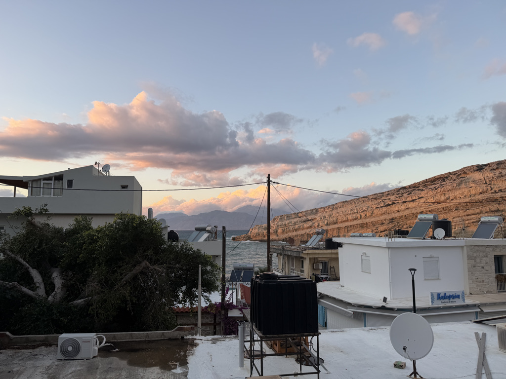 I heard a rumor that there was a flu going around after Christmas, and I made the executive decision to book a little apartment in Matala, a little hippy beach village in the south, for New Years. I was thinking if it’s anything like my personal little beach village, it would absolutely not be hopping with people. And I was so right! We had to drive over a village or two to find dinner the two nights we were there, which included one delicious dinner at a place that boasted having mama’s cooking. Mama took our orders and then proceeded to go back into the kitchen and cook for us. Papa kept pouring the raki, which should have killed any possibility of germs in anyone’s systems.