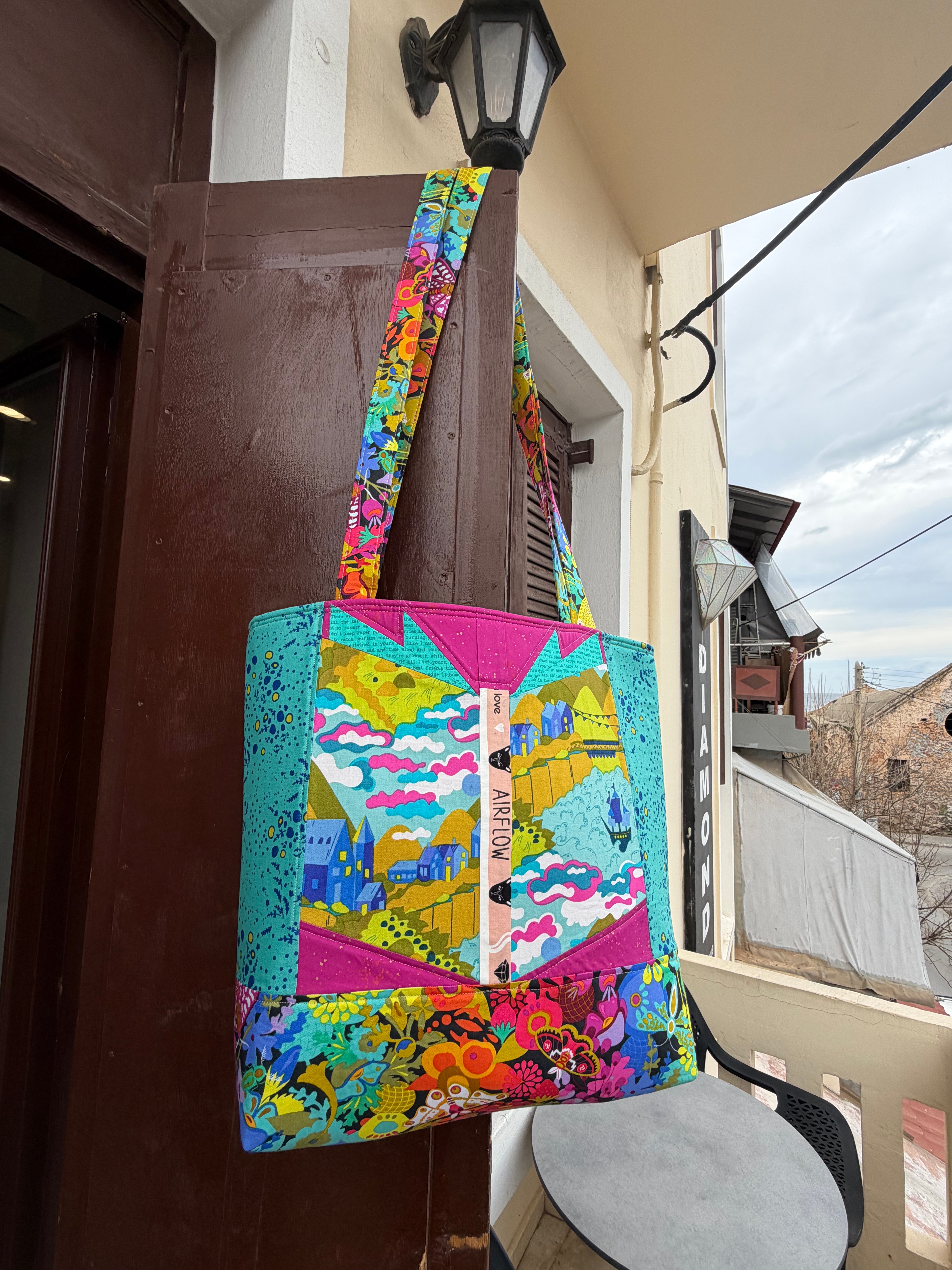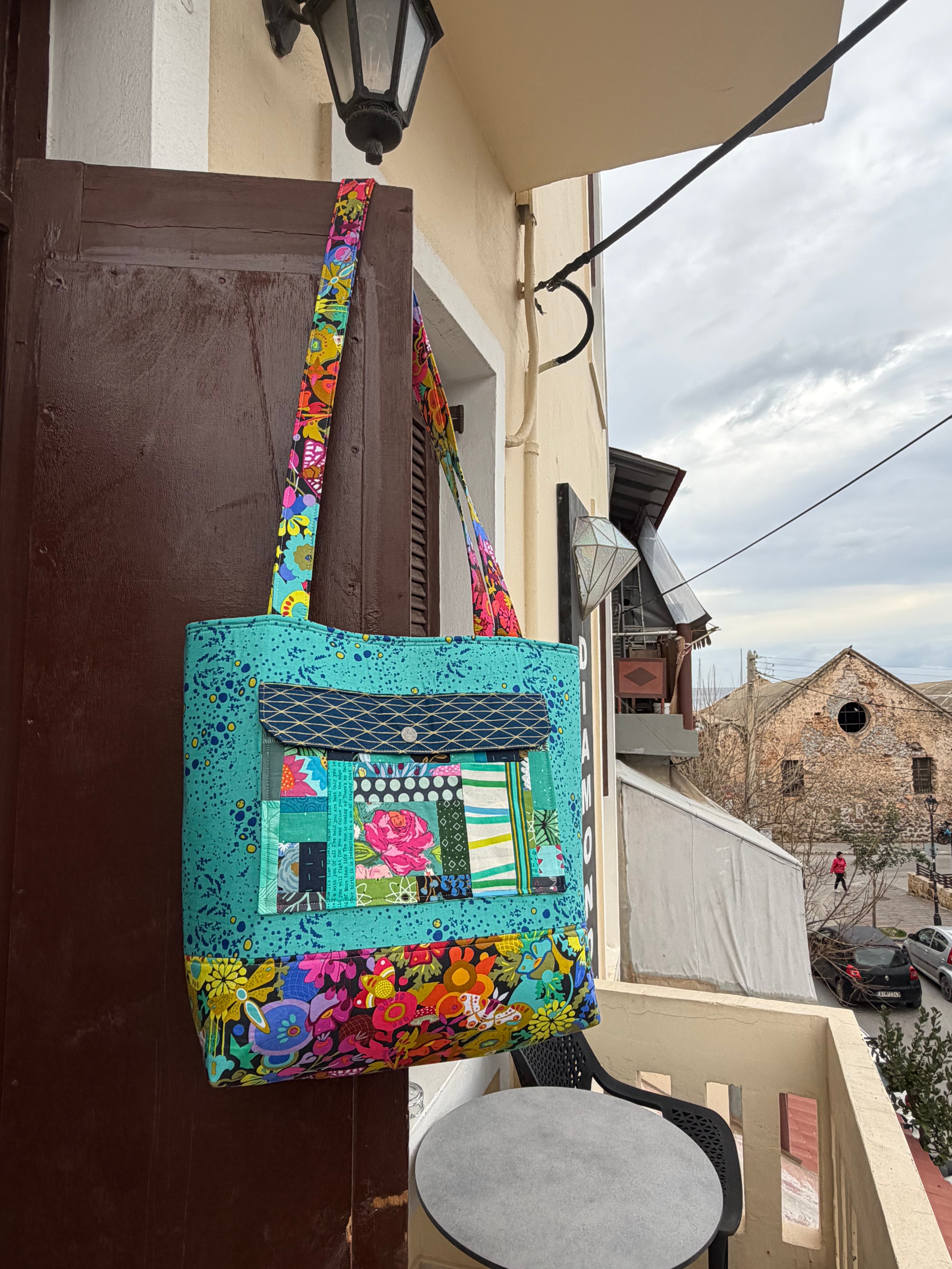 Last week was the two year anniversary of our dog Chunk dying, and I decided I needed a little brightness in my day. So I made myself a new tote bag. With lots of pockets so I’ll stop spending forever digging around looking for things like pens or a deck of vintage Chippendale’s playing cards. I used some “orphaned” quilt blocks for the extra fun bits.